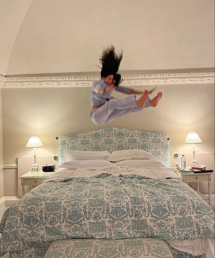 Some people meditate before bed. She launches herself into sleep like a caffeinated ninja. That airborne moment? Pure chaotic joy. It’s childhood nostalgia, adult escapism, and core-strength chaos all rolled into one flying pajama tornado.
