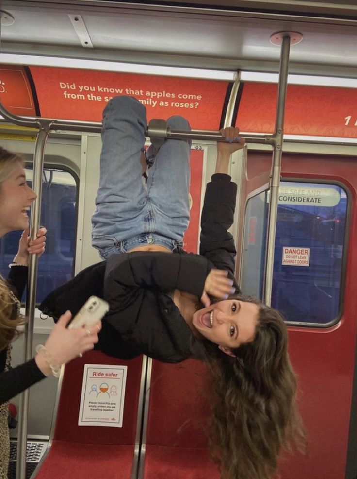 This metro ride started off normal and quickly turned into Cirque du Soleil. Hanging upside down, she’s laughing at her friend, at the moment, and honestly — at the concept of public decorum. Somewhere between absurdity and athleticism, she’s just vibing.